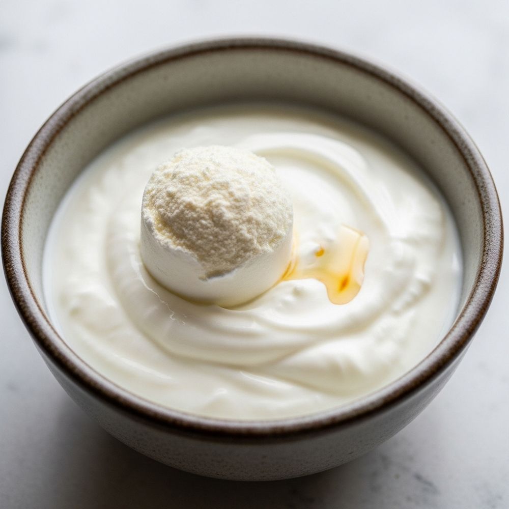 In a medium bowl, add the organic Greek yogurt and protein powder. If using, add the vanilla extract and a tiny pinch of sea salt.