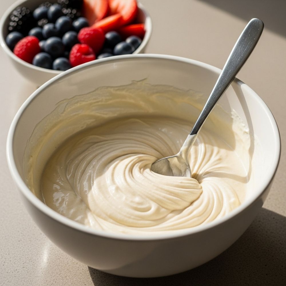 Whisk or stir the yogurt and protein powder together until completely smooth and creamy, adjusting the thickness with a splash of water or milk if it is too thick.