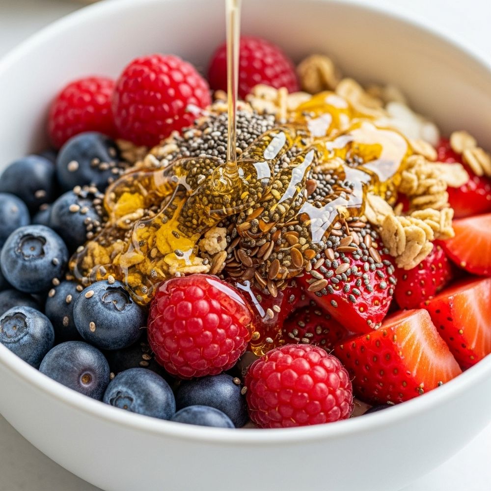 Sprinkle chia seeds, ground flaxseed, and granola evenly over the berries, then drizzle honey or maple syrup over the entire bowl. Add a swirl of almond or peanut butter, if using.