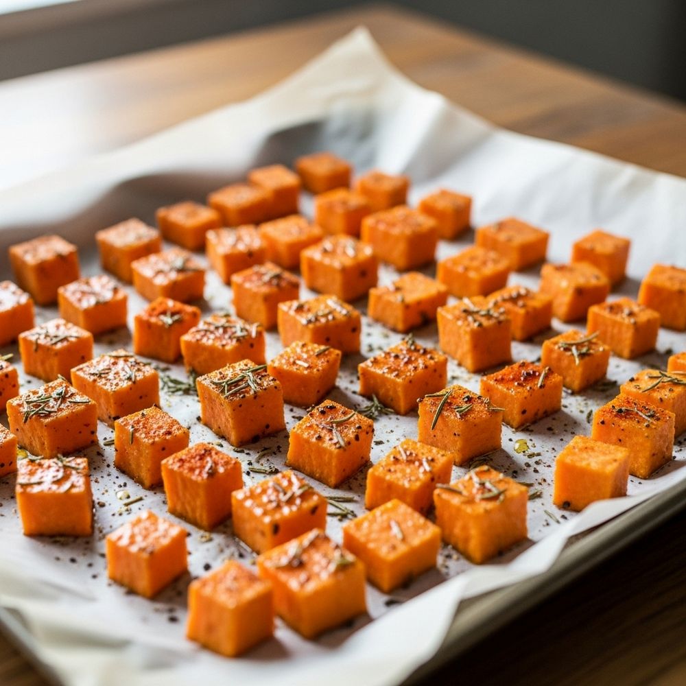 Preheat the oven to 200°C (400°F). Toss the cubed organic sweet potatoes with olive oil, cumin, smoked paprika, chili powder, and salt until evenly coated. Spread on a baking tray in a single layer. Roast for 20–25 minutes, turning once halfway, until golden at the edges and tender.