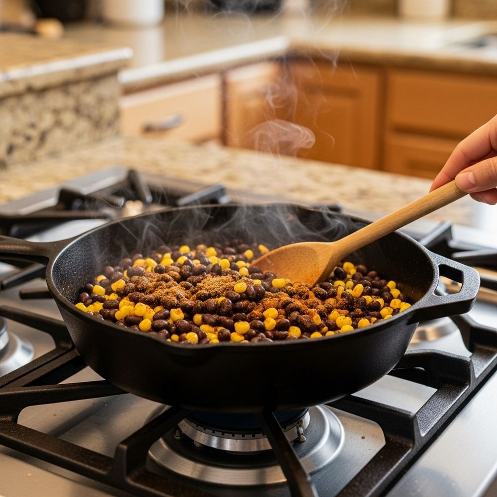 In a medium skillet over medium heat, add a splash of water or a teaspoon of olive oil. Add the black beans and corn. Sprinkle with cumin, smoked paprika, salt, and pepper. Cook, stirring occasionally, for 4–5 minutes until warmed through and lightly fragrant. Turn off the heat.