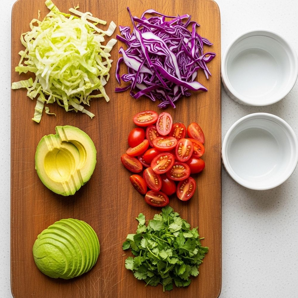 While the sweet potatoes roast, shred the lettuce or cabbage, halve the cherry tomatoes, slice or cube the avocado, and chop the cilantro. Arrange everything in small bowls or on a platter to make assembly easier.