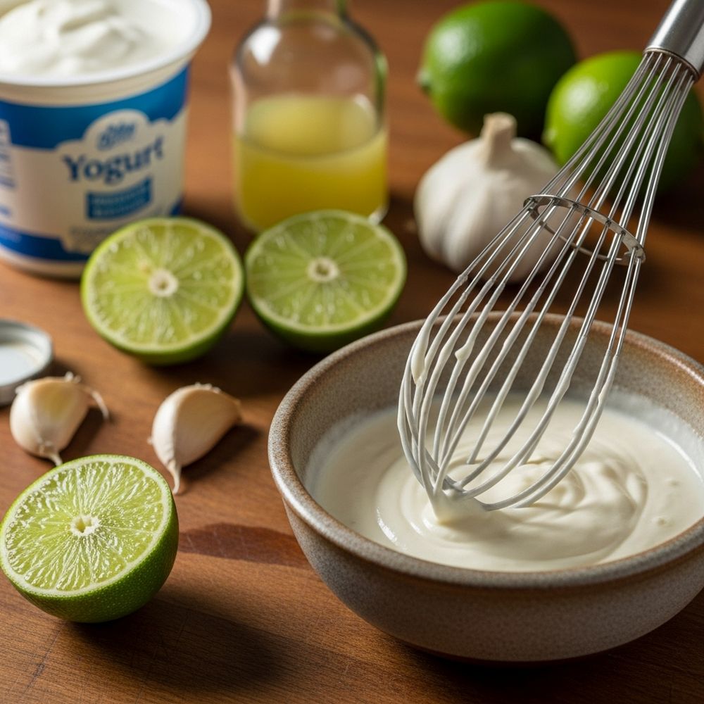 In a small bowl, whisk together the yogurt, lime juice, olive oil, garlic, honey or maple syrup, and salt until smooth. Add water, a spoonful at a time, whisking until you reach a pourable, drizzling consistency. Taste and adjust lime or salt if needed.