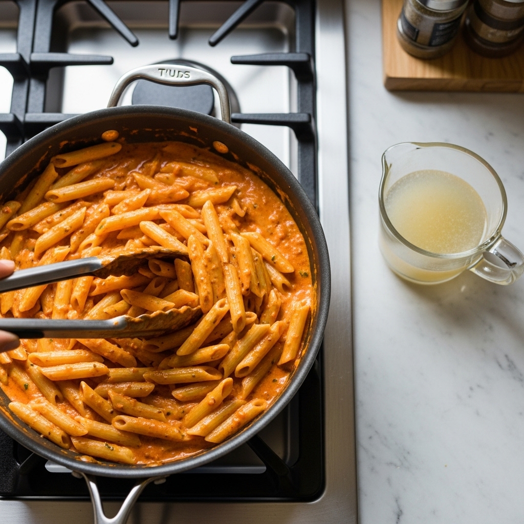 Add the drained pasta directly into the skillet of creamy tomato sauce. Toss gently to coat every piece, adding a splash of reserved pasta water (a tablespoon at a time) as needed to loosen the sauce to your preferred consistency. The sauce should cling to the pasta but still be silky.