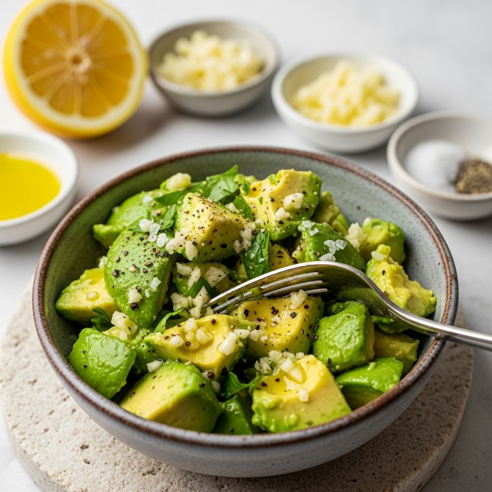 Scoop the avocado into a small bowl. Add lemon juice, olive oil, minced garlic (if using), a pinch of sea salt, and pepper. Mash with a fork until mostly smooth with a bit of texture.