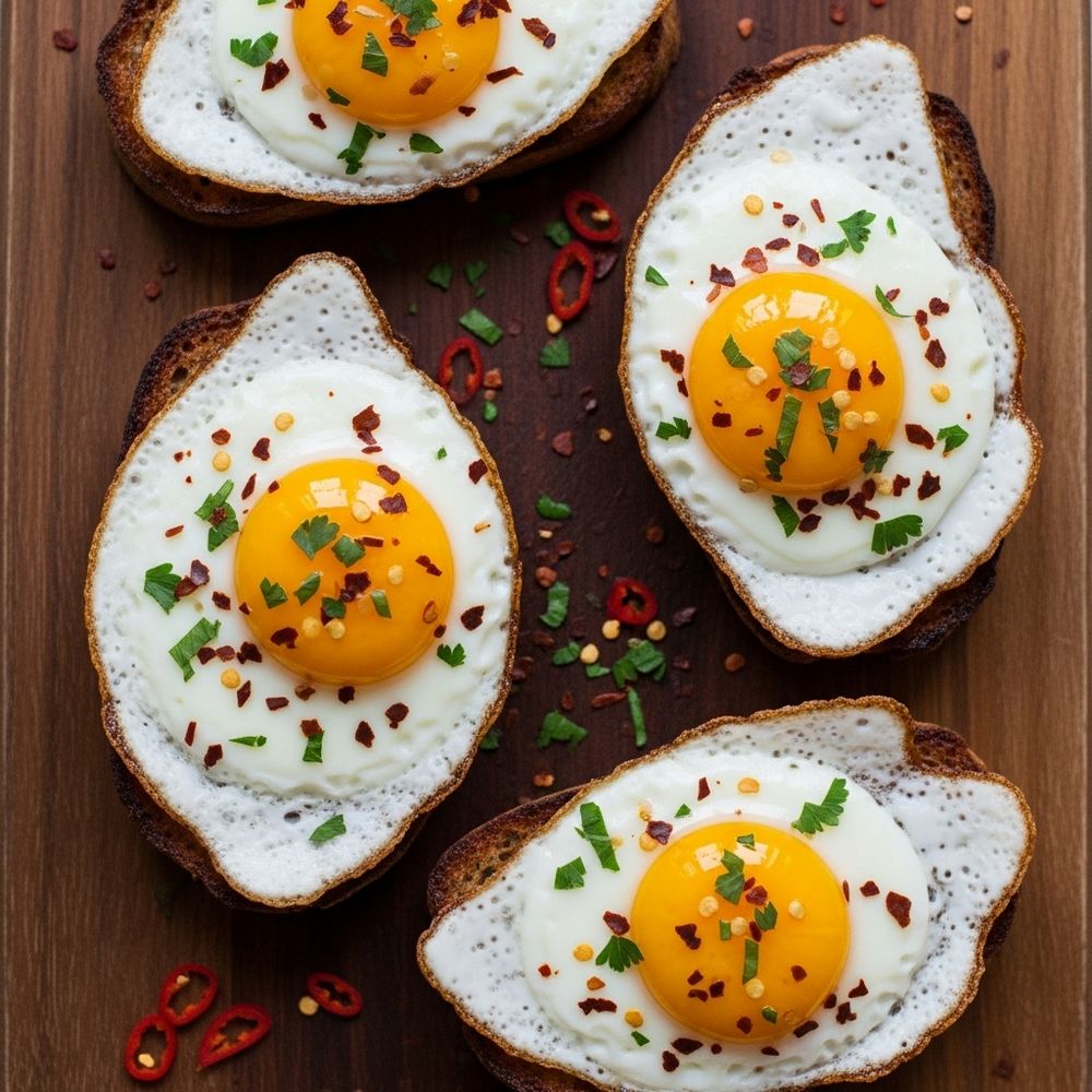 Gently place one cooked egg on each slice of avocado toast. Sprinkle red chili flakes, chopped fresh herbs, and an extra pinch of salt or pepper over the top.