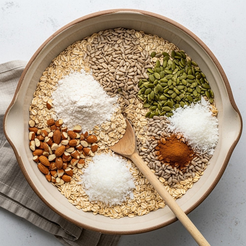 In a large mixing bowl, combine the rolled oats, whole wheat flour (or oat flour), chopped nuts, mixed seeds, chia or ground flax, shredded coconut (if using), baking powder, salt, and cinnamon. Stir until everything is evenly distributed.