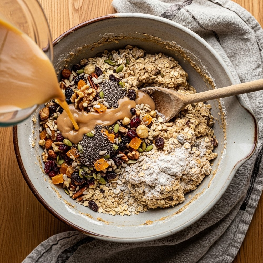 Pour the wet mixture into the bowl of dry ingredients. Stir with a spatula or wooden spoon until all the oats, nuts, and seeds are coated and a thick, sticky dough forms. Fold in dried fruit if using. Let the mixture rest for 5 minutes so the oats and seeds hydrate.