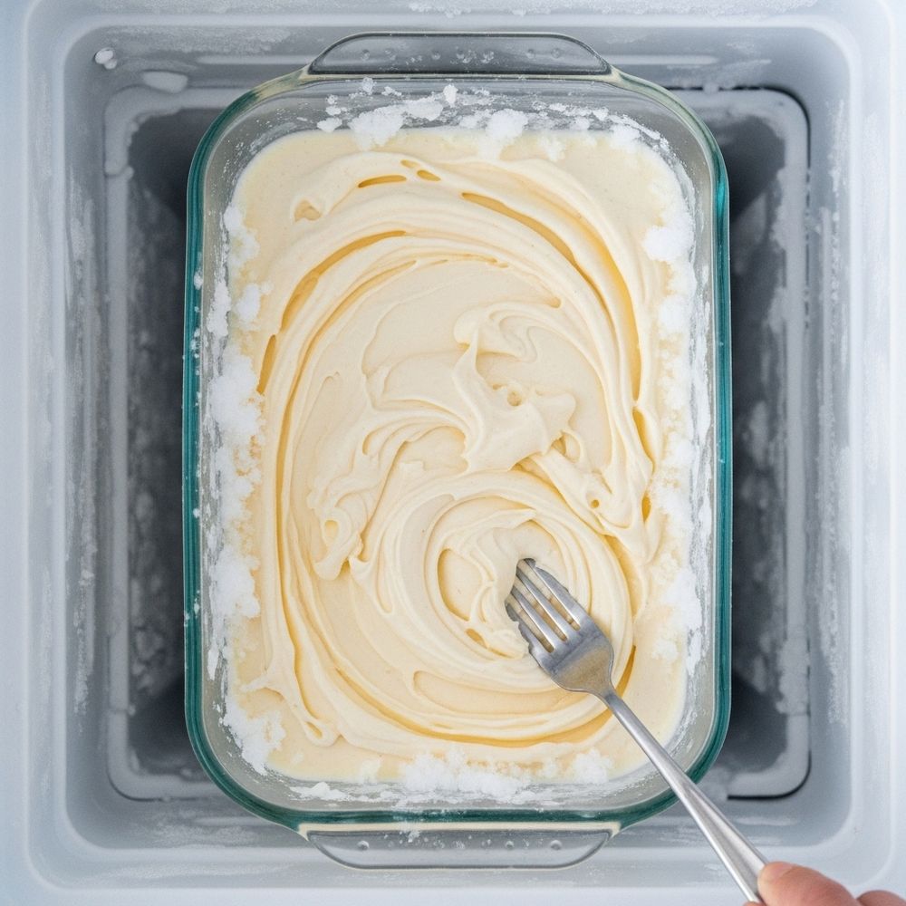 If not using an ice cream maker, pour the chilled base into a shallow freezer-safe dish. Freeze for 2–3 hours, stirring every 30–40 minutes with a fork or whisk to break up ice crystals, until thick and nearly solid. Transfer to a pint container and smooth the top.