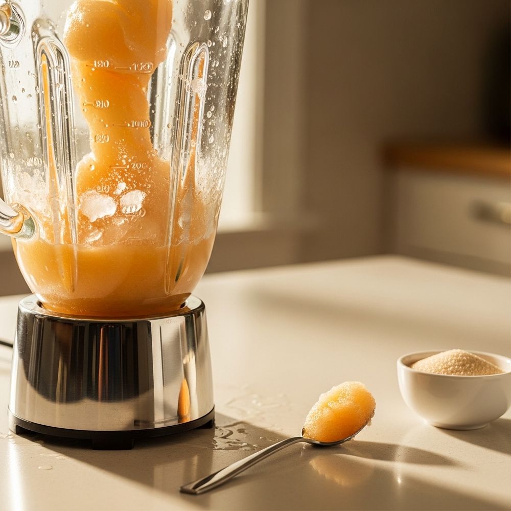 Check the texture. If it is too thin, add up to 1 more cup of ice and blend again. Taste and adjust sweetness by adding a little more sugar if needed, then blend briefly.