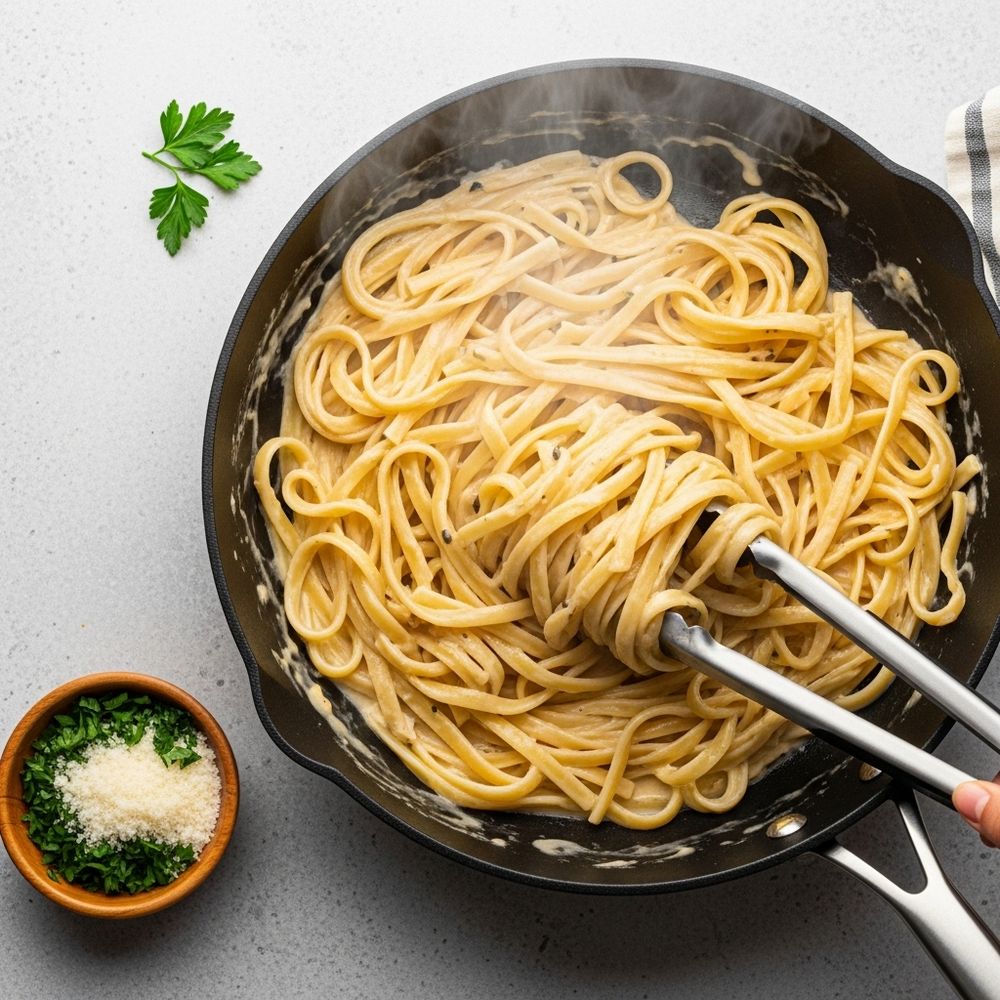Add the drained hot pasta directly into the skillet with the sauce. Toss gently with tongs, adding more reserved pasta water a little at a time until the sauce coats every strand in a glossy, creamy layer. Taste and adjust seasoning with more salt, pepper, or lemon.
