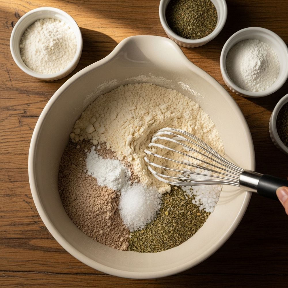 Whisk flours, protein powder, baking powder, salt, and optional herbs together.