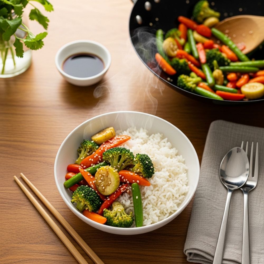 These Quick Stir-Fry Veggies are a perfect “clean out the fridge” solution because you can swap in whatever vegetables you have on hand. Pair them with steamed jasmine rice, brown rice, or noodles, or spoon them alongside grilled chicken, tofu, or shrimp for a complete meal. You can keep the sauce mild and family-friendly or add chili for extra heat. This stir-fry is also great for meal prep; it reheats well and adds color and nutrients to any lunch box.