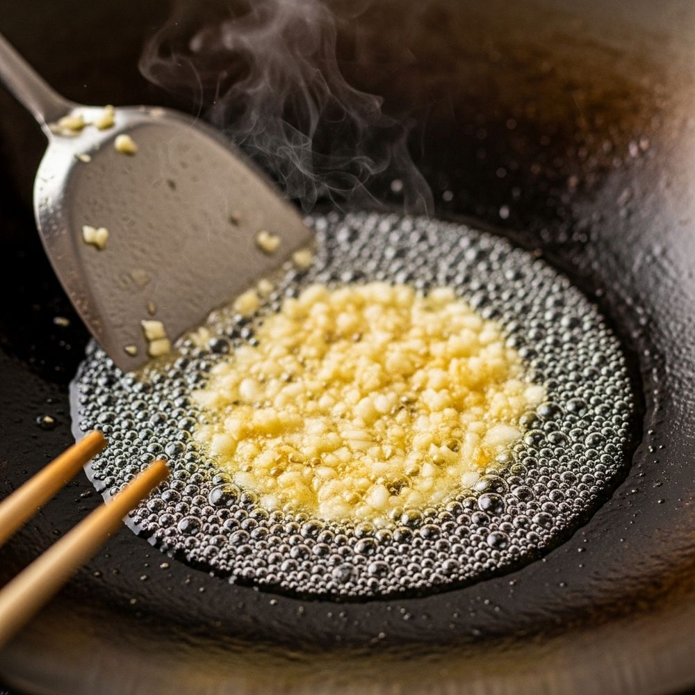 Add the minced garlic and ginger to the hot oil. Stir constantly for 20–30 seconds until very fragrant, being careful not to let them burn.