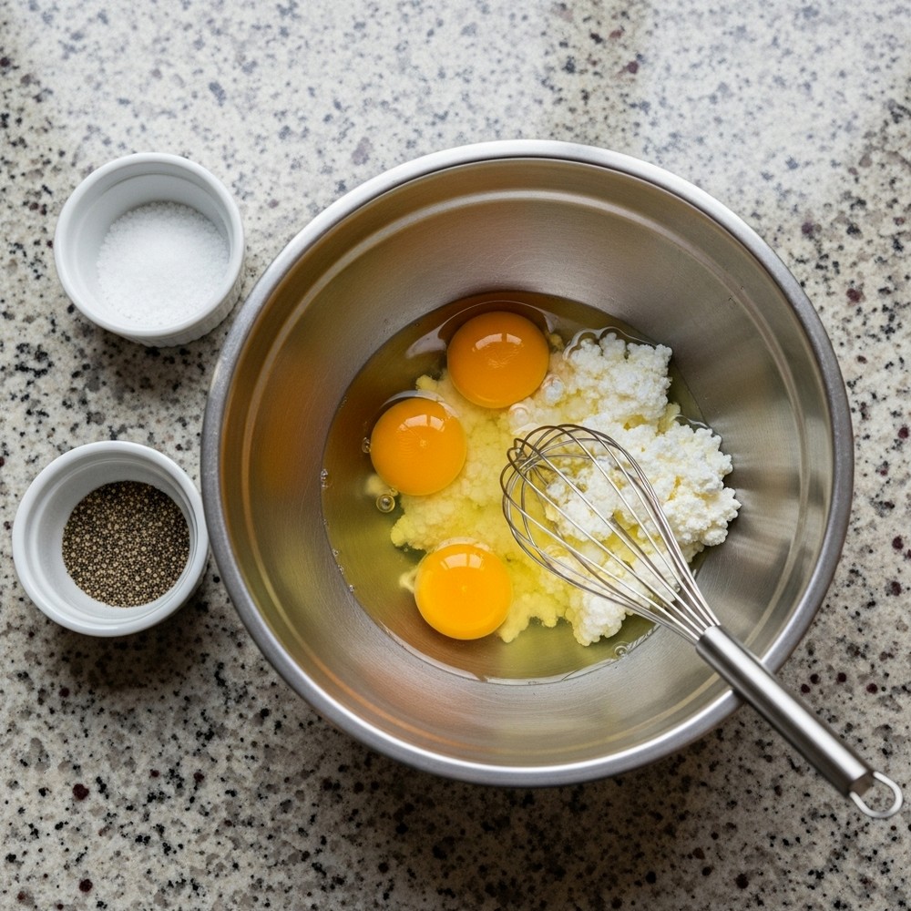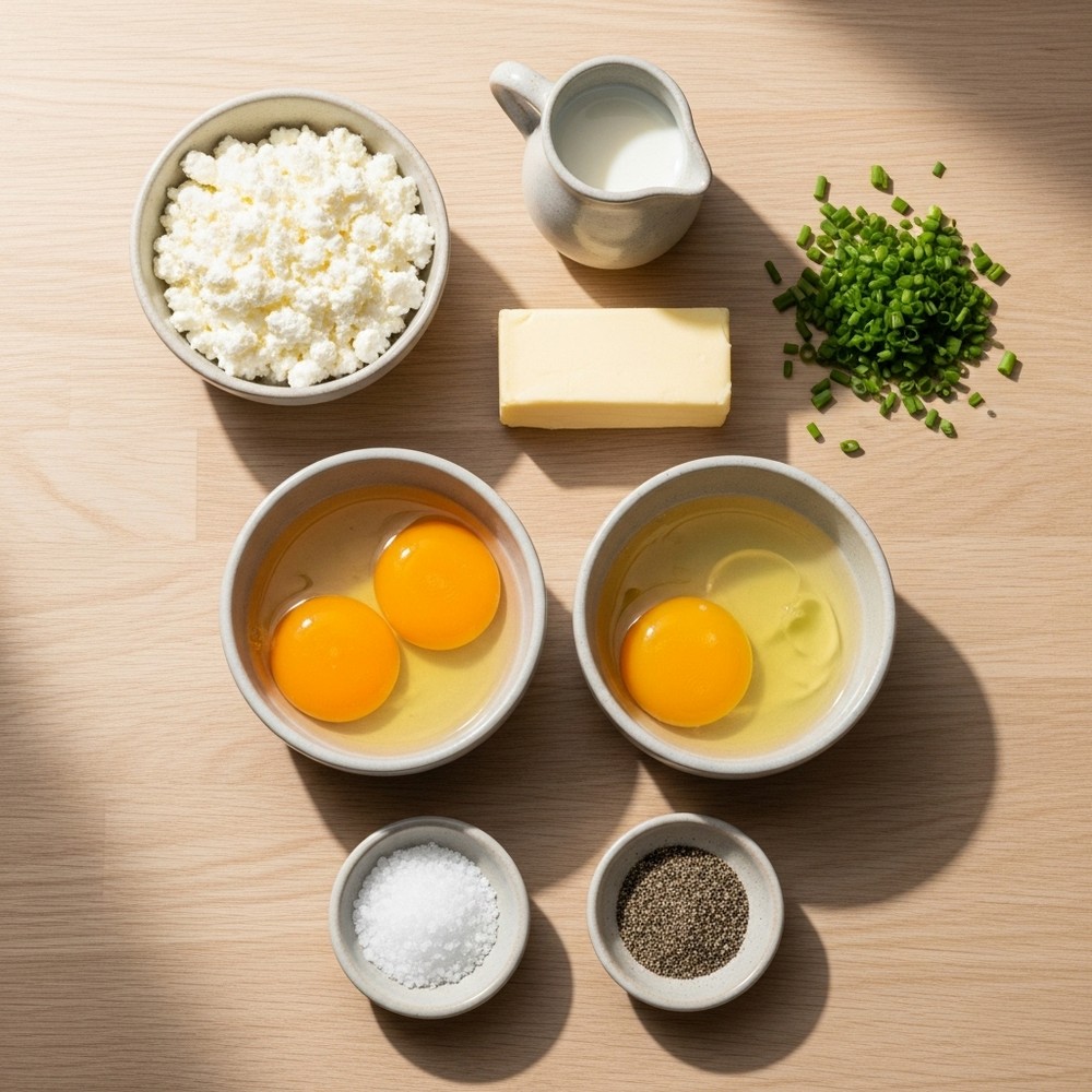 Crack the eggs into a medium bowl. Add cottage cheese, milk or cream (if using), salt, and pepper. Whisk gently until the yolks are broken and everything is mostly combined but not completely smooth.