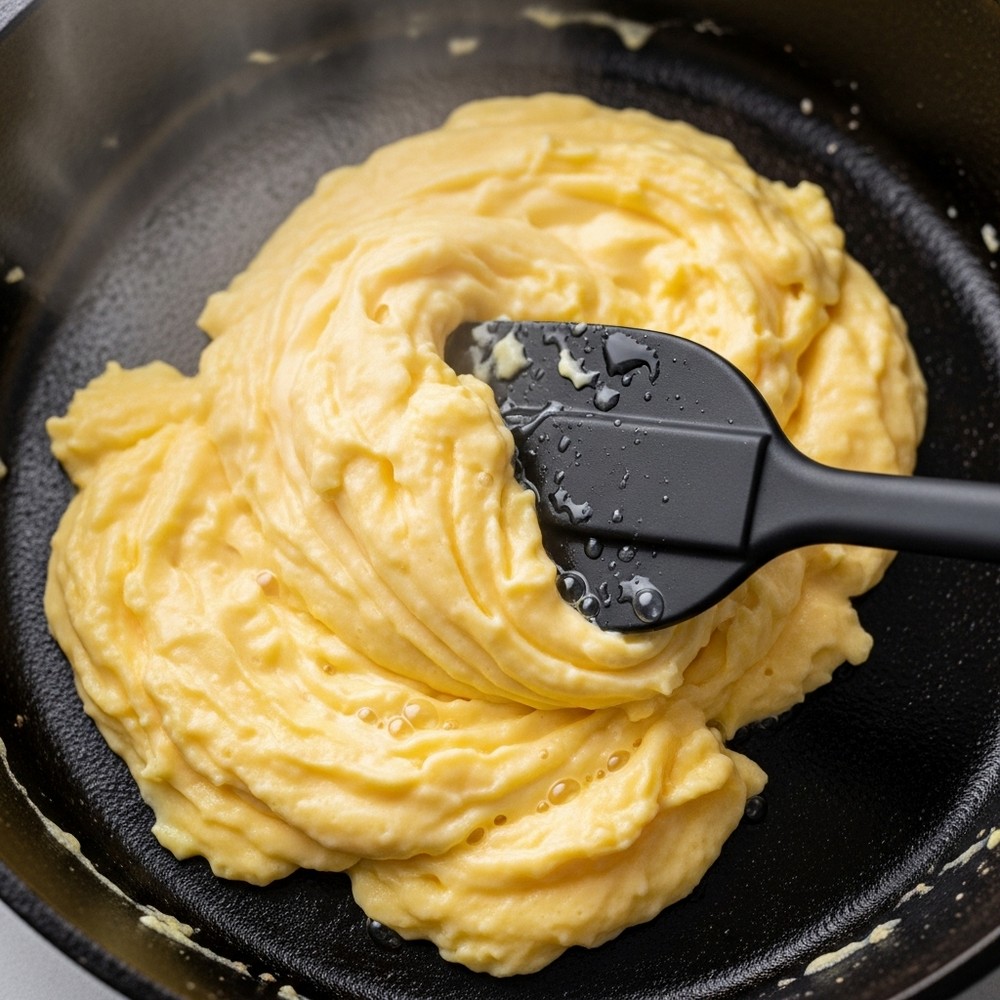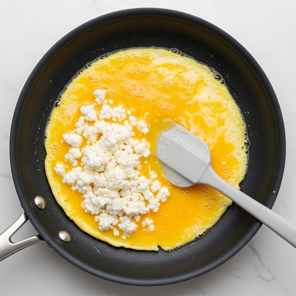 Pour the egg and cottage cheese mixture into the warm pan. Let it sit undisturbed for 10–20 seconds until the edges just begin to set, then use a spatula to gently push the eggs from the edges toward the center.