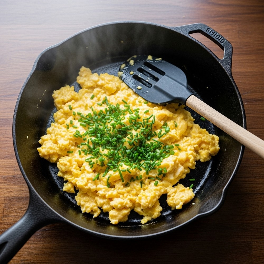 When the eggs look softly set but still a little glossy and slightly underdone, remove the pan from the heat. Stir in chopped chives or green onions, and taste for salt and pepper, adjusting as needed.