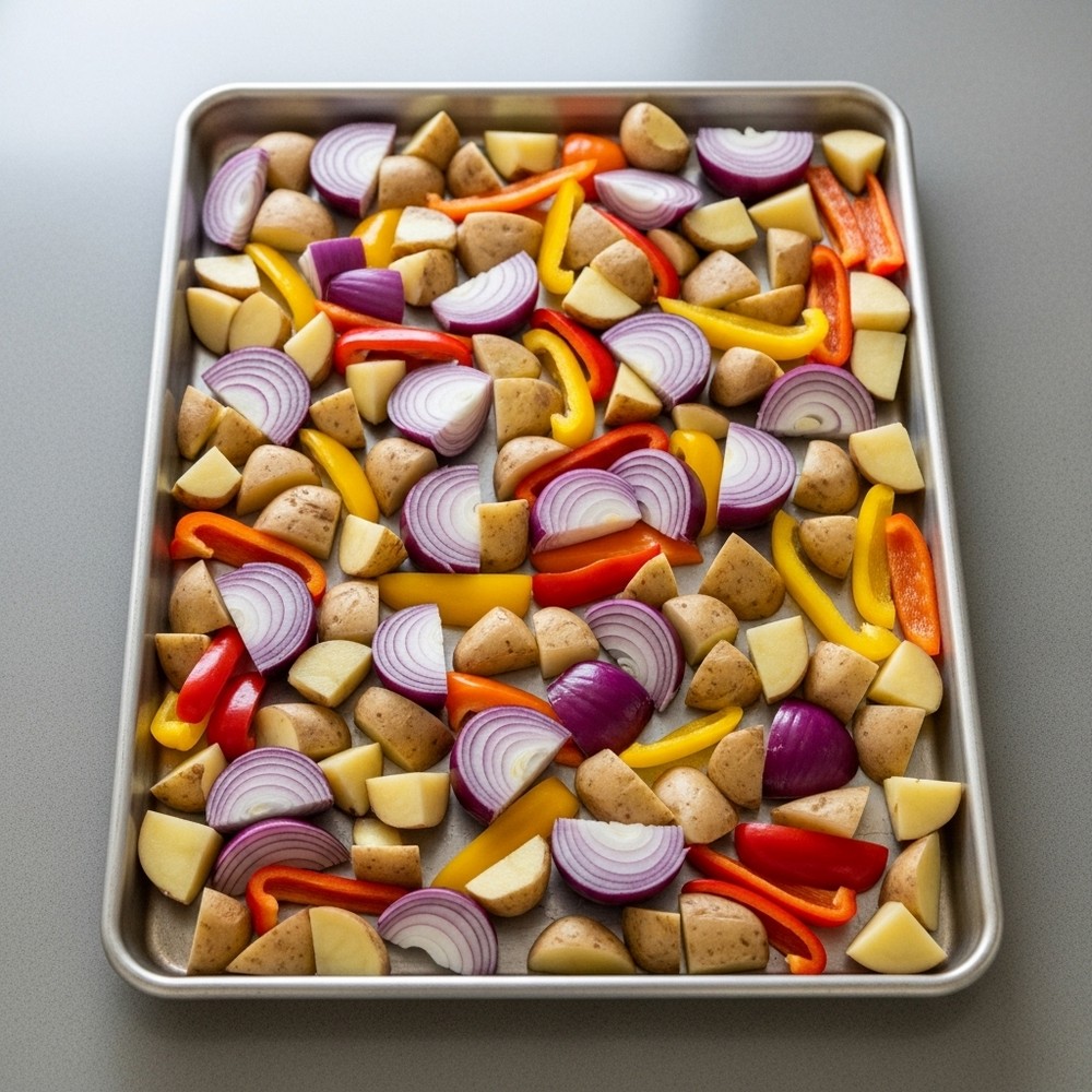 Cut the potatoes into chunks, onion into wedges, and bell peppers into strips. Spread them on the sheet pan in an even layer.