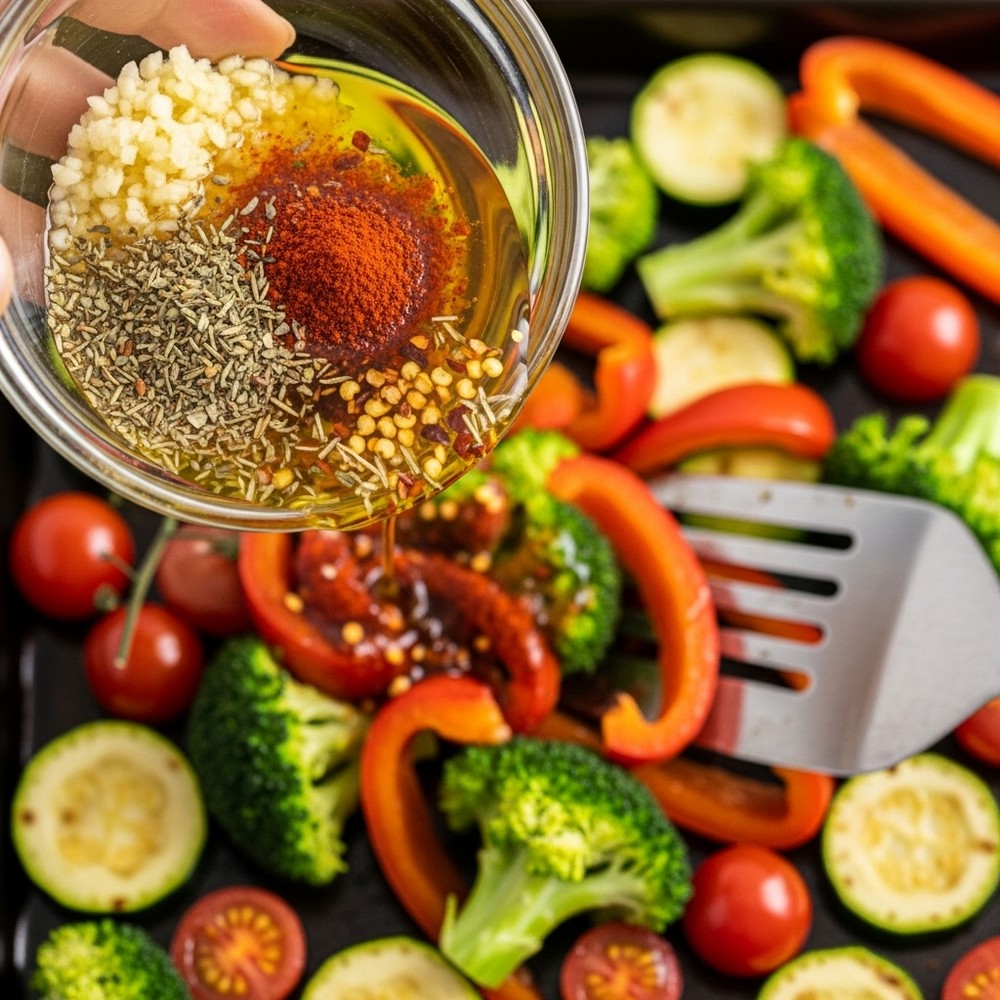 Mix olive oil, garlic, salt, pepper, herbs, paprika, and chili flakes; drizzle over vegetables and toss to coat.