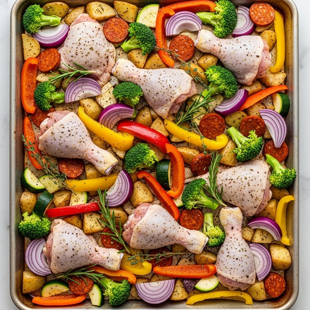 Scatter the sausage slices and chicken pieces over the seasoned potatoes and vegetables. Toss gently again so the meat gets a light coating of oil and spices, then spread everything into a single, even layer.