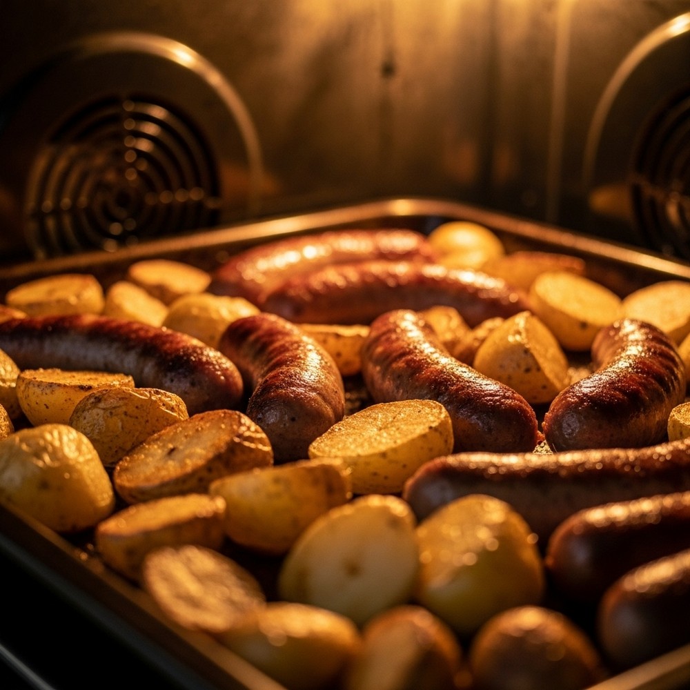 Roast for 25–35 minutes, flipping everything halfway, until the potatoes are tender, the sausage edges are browned, and the chicken pieces are fully cooked (juices run clear, no pink inside).