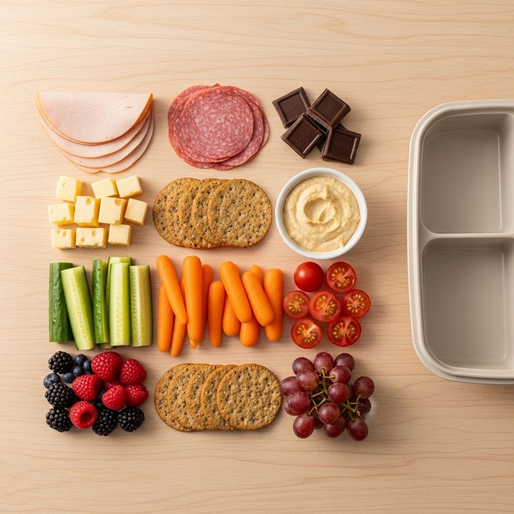 In a divided lunch container, arrange proteins and cheese in one area, crackers in another, veggies together, and fruits together. Place nuts and chocolate in a small section.