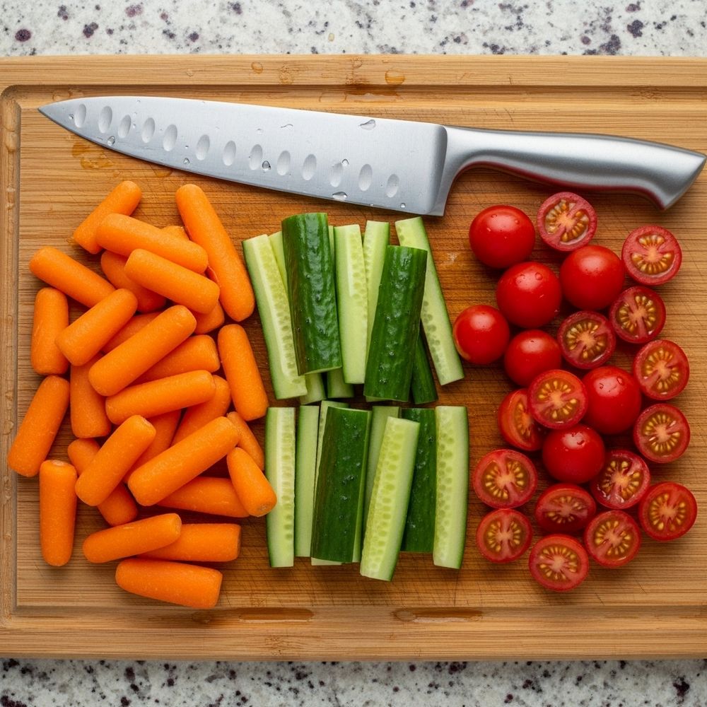 Rinse and dry the baby carrots, cucumber, and tomatoes. Slice cucumbers into sticks or coins. Keep pieces similar in size so they pack easily and look balanced.