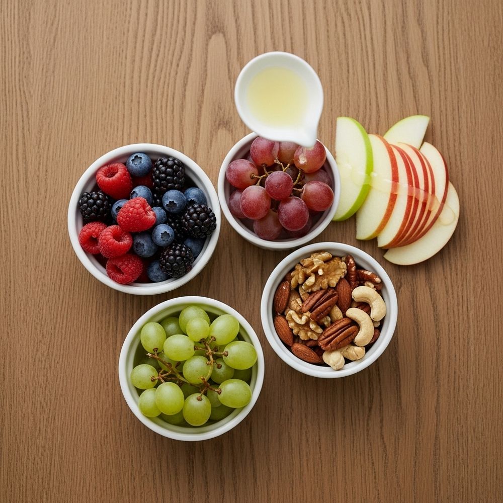 Rinse and pat dry berries and grapes. If using apple slices, toss them lightly with a few drops of lemon juice to prevent browning. Measure out the mixed nuts.