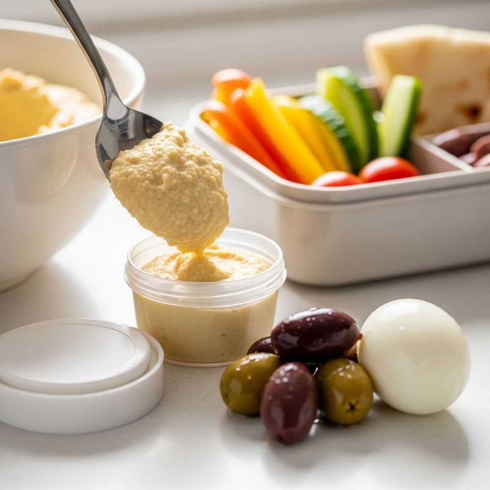 Spoon hummus or yogurt dip into a small lidded container or silicone cup. Add optional extras like olives, mini pickles, or a hard-boiled egg to separate sections.