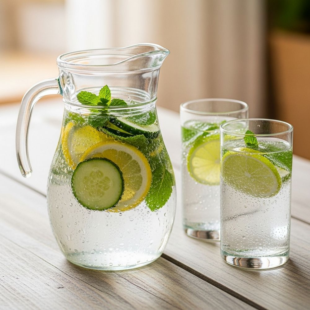 Just before serving, fill tall glasses with ice cubes and a few fresh slices of cucumber and citrus. Give the pitcher a gentle stir to redistribute the fruit and mint without breaking them apart.