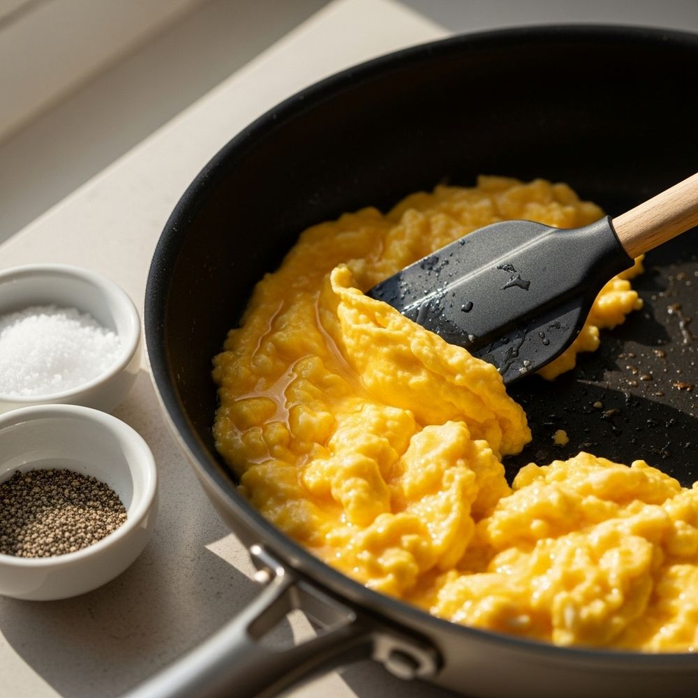 In a bowl, whisk eggs with milk, salt, and pepper. Melt butter or heat oil in a nonstick pan over medium-low heat. Pour in the eggs and gently scramble until soft, fluffy, and just set. Remove from heat.